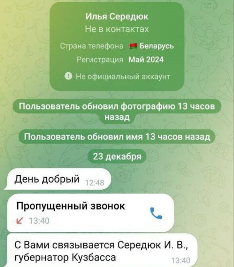 Губернатор Кузбасса в соцсетях сообщил, что мошенники в очередной раз создали фейковый аккаунт на его имя. Они рассылают сообщения или пытаются дозвониться до потенциальных жертв.