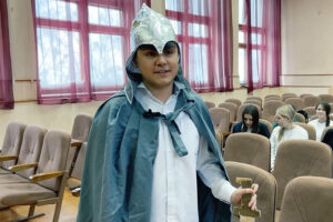 Девятиклассник Юсуф Худжамов сыграл богатыря. Юноша, узбек по национальности, впервые примерил этот образ. Надел рубашку, шлем, взял в руки меч, который мастерски изготовили ребята, отвечающие за декорации и реквизит.